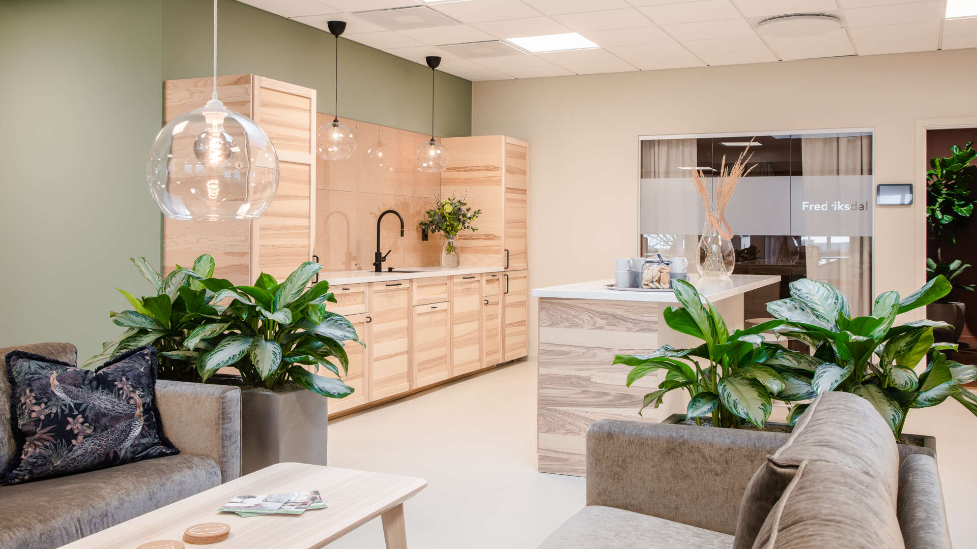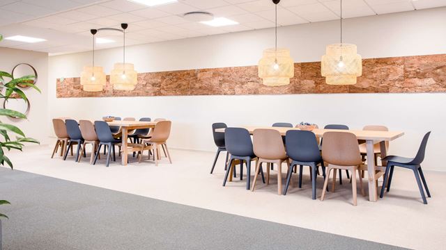 Grönt är skönt på många sätt. Att vi människor blir lugna av växter inomhus är bevisat. I en allt mer stressad vardag kan så enkla saker som mycket grönska och växter på kontoret vara skönt för både sinne och själ. Hela kontoret är omslutet av en grön behaglig färg, liksom av växter och grönska. Miljöaspekten inte att förglömma. Givetvis tänker vi grönt i form av miljö också, inte minst i köket där vi valt matstolar i återvunnen plast. Och om vi återvinner allting i köket? Givetvis!