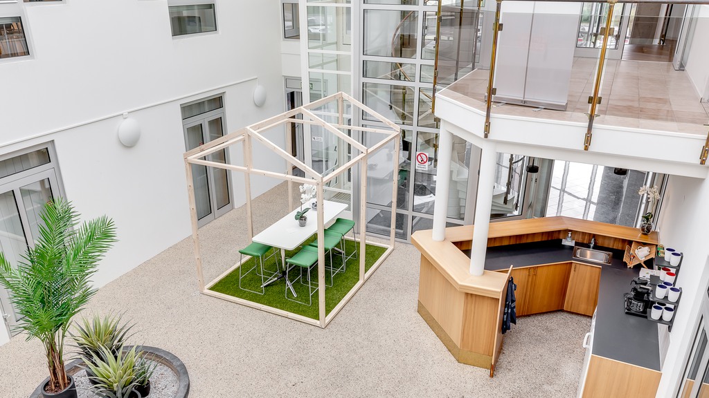 Stora och små kontor samt kontorshotell. Ljus entré med atrium, som kan bokas för större möten.