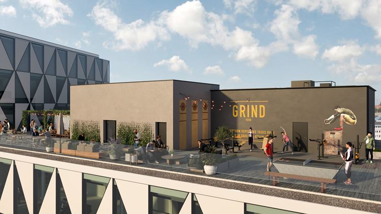 Takterrass med utomhusarbetsplatser, gym och fantastisk utsikt