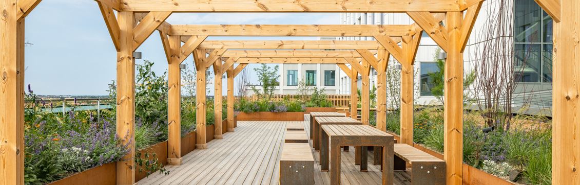 För den som hellre nyttjar takterrassen för en paus och återhämtning finns det självklart även rum för avkoppling på denna rofyllda och ombonade plats. I direkt anslutning till många av kontoren skapar vi dessutom balkonger, perfekta för möten eller fika med teamet.
