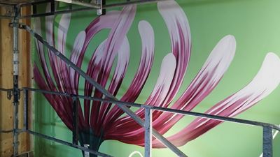 I Kvartettens trapphus möts man av en muralmålning skapad av Malin Sparrvardt, tillsammans med konstföreningen Streetcorner – en visuell resa som lyfter intrycken och skapar en känsla av ljus, trivsel och välkomnande.